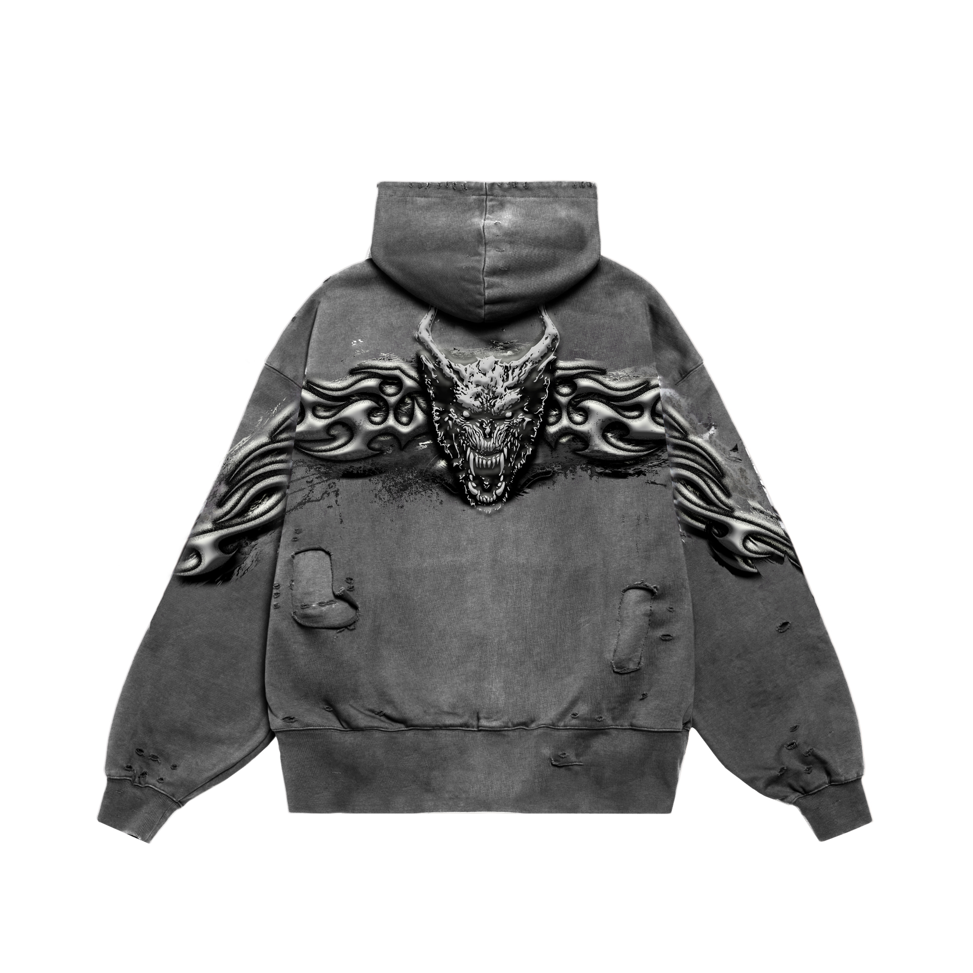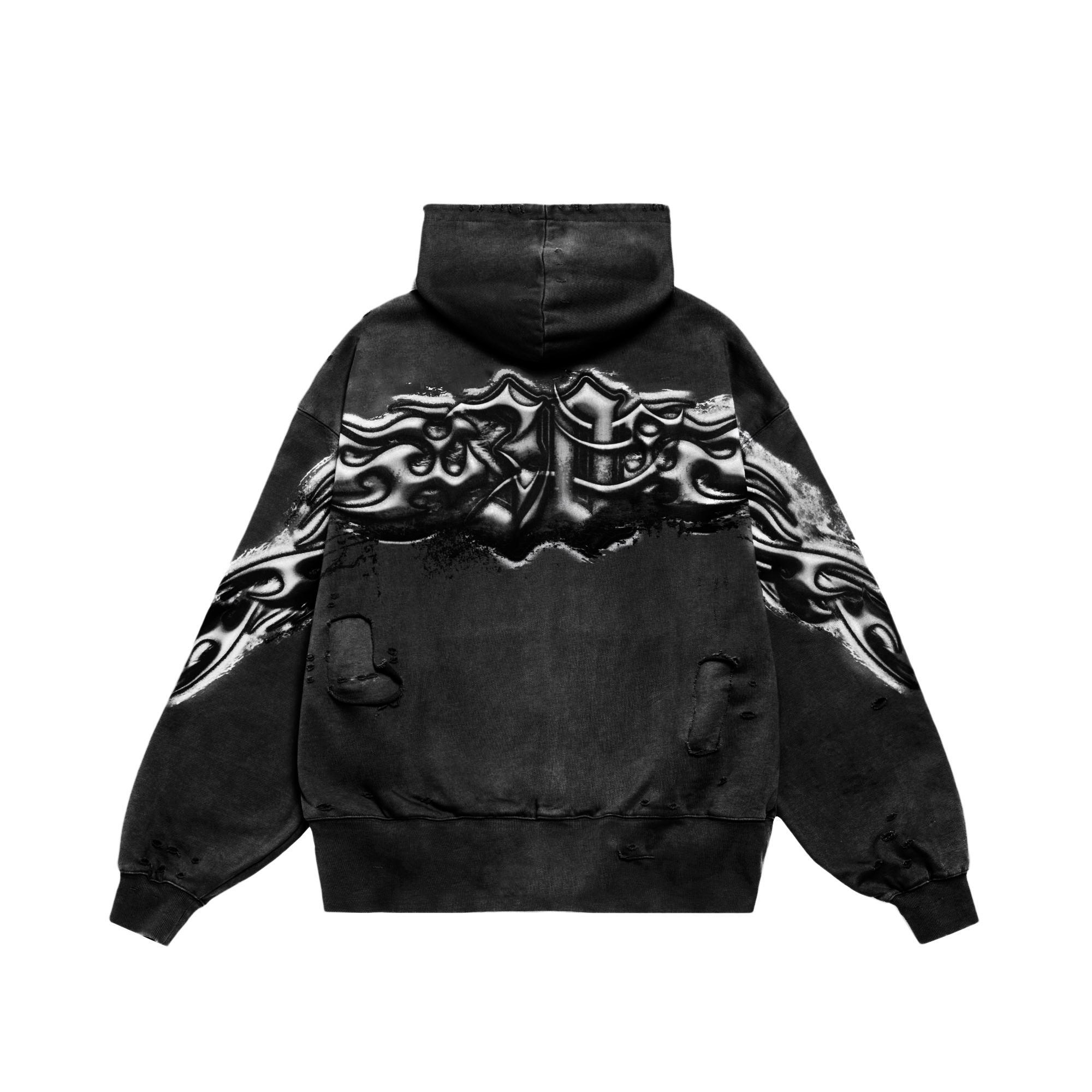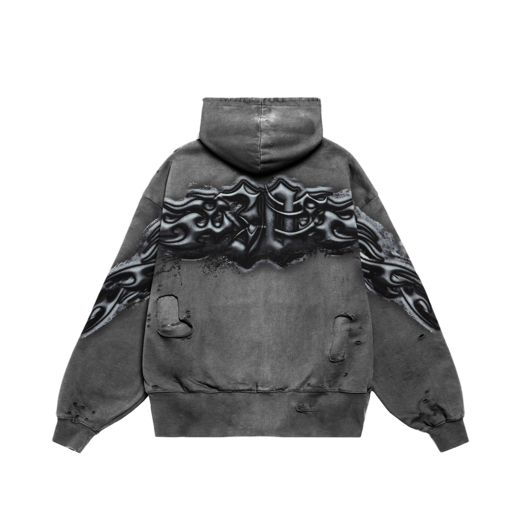 Худи оверсайз из плотного футера, окрашен по технологии Stone wash, приспущенная линия плеча, втачной рукав, накладной передний карман, принт шелкографией.