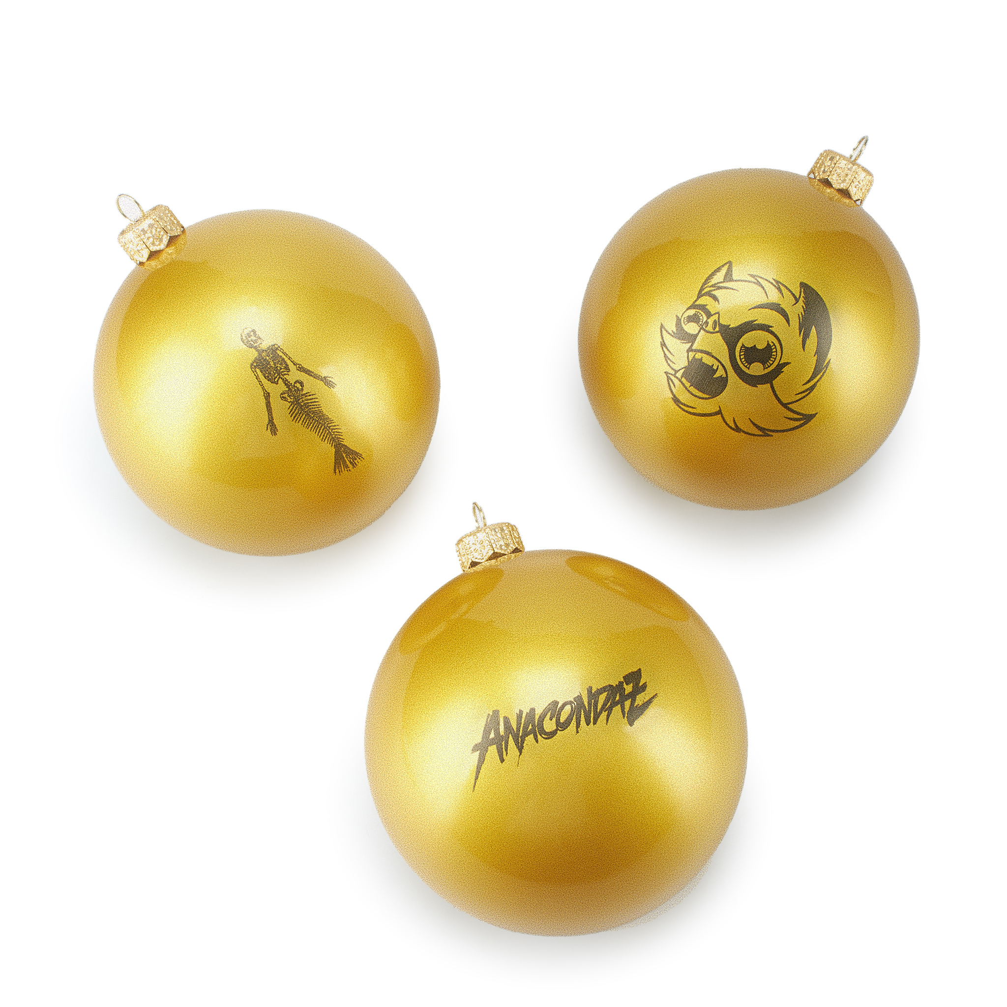 Сразу вся коллекция из трех блестящих глянцевых шаров золотого цвета с тремя различными принтами.
